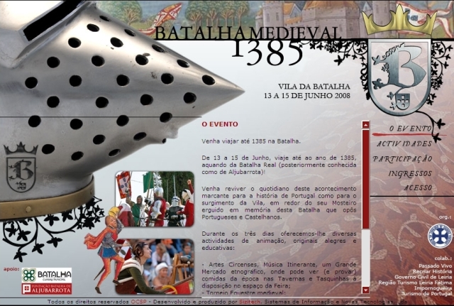 | Além do desenvolvimento do website este projecto envolveu o estudo de imagem e criação de logotipo para o evento organizado pela OSCP, bem como a criação de diversos suportes de comunicação, tais como SPOT Publicitário para a Televisão, Posters e Flyers. O evento decorreu na Batalha entre 13 e 15 de Junho, onde os visitantes foram convidados a viajar até ao ano de 1385, aquando da Batalha Real (posteriormente conhecida como de Aljubarrota). |